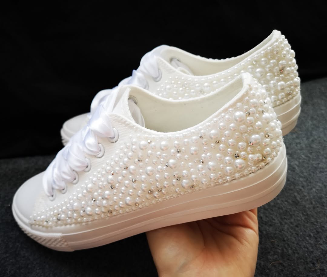 Absolútny vrchol svadobnej elegancie. Tento model je určený pre nevesty, ktoré hľadajú niečo skutočne výnimočné. Stovky perličiek a drobných kryštálov pokrývajú takmer celý povrch tenisky a vytvárajú dojem snehobieleho luxusu. Pôsobia čisto a nadčasovo.
