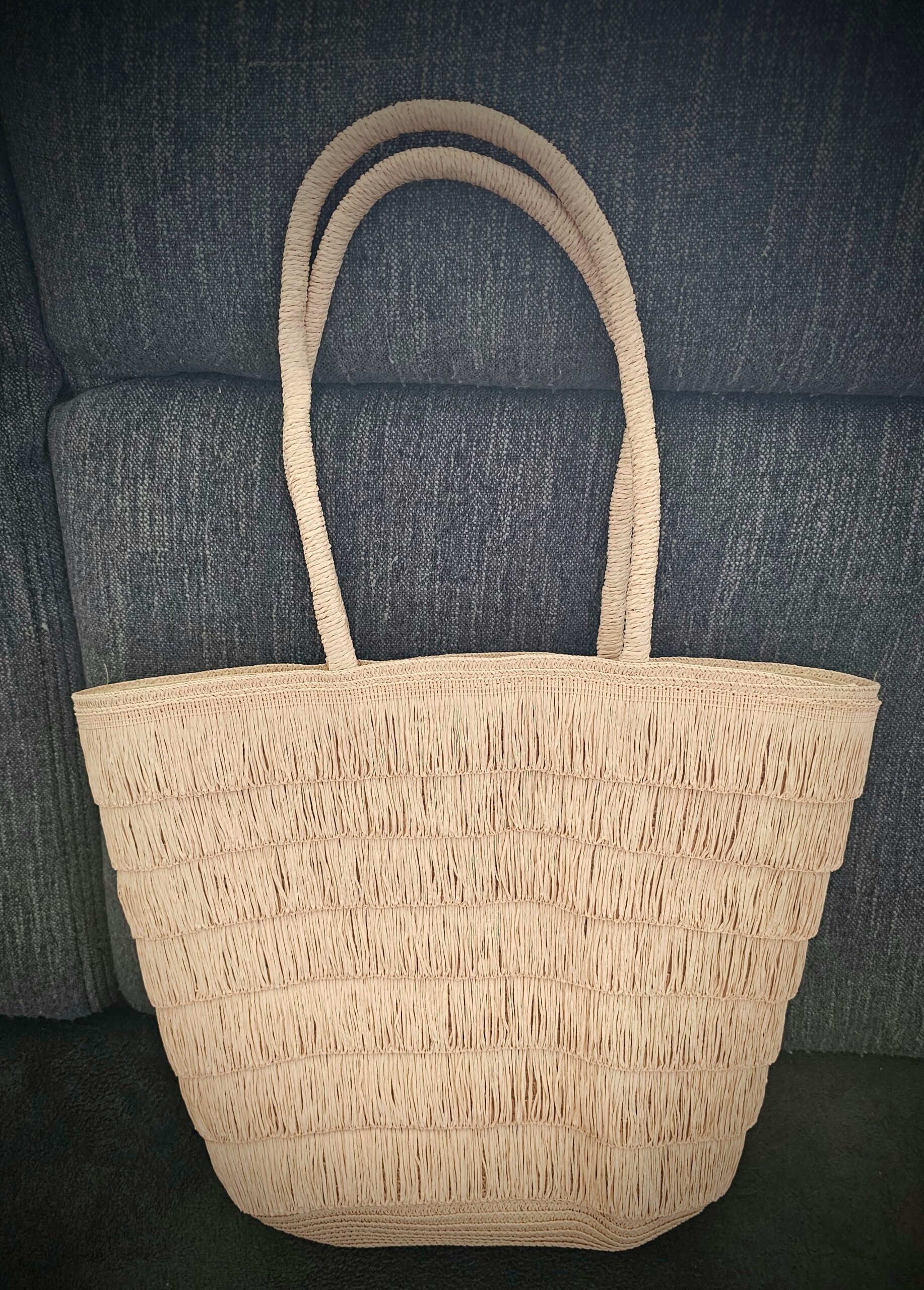 Z veľkej tašky budete nadšení. Celá je ozdobená strapcami , ktoré sú zošité z oboch strán, aby boli pevné. Tašku vynosíte k vode, na pláž, do mesta, na nákup a na ďalšie voľnočasové aktivity. Zapína sa na zips, vo vnútri má podšívku s malým vreckom na drobnosti. Strapce sú z papierovej priadze, vytvárajú zaujímavú vrstvenú štruktúru . Uchá sú na nosenie v ruke, dostatočne dlhé aj na rameno. Dno je oválne.