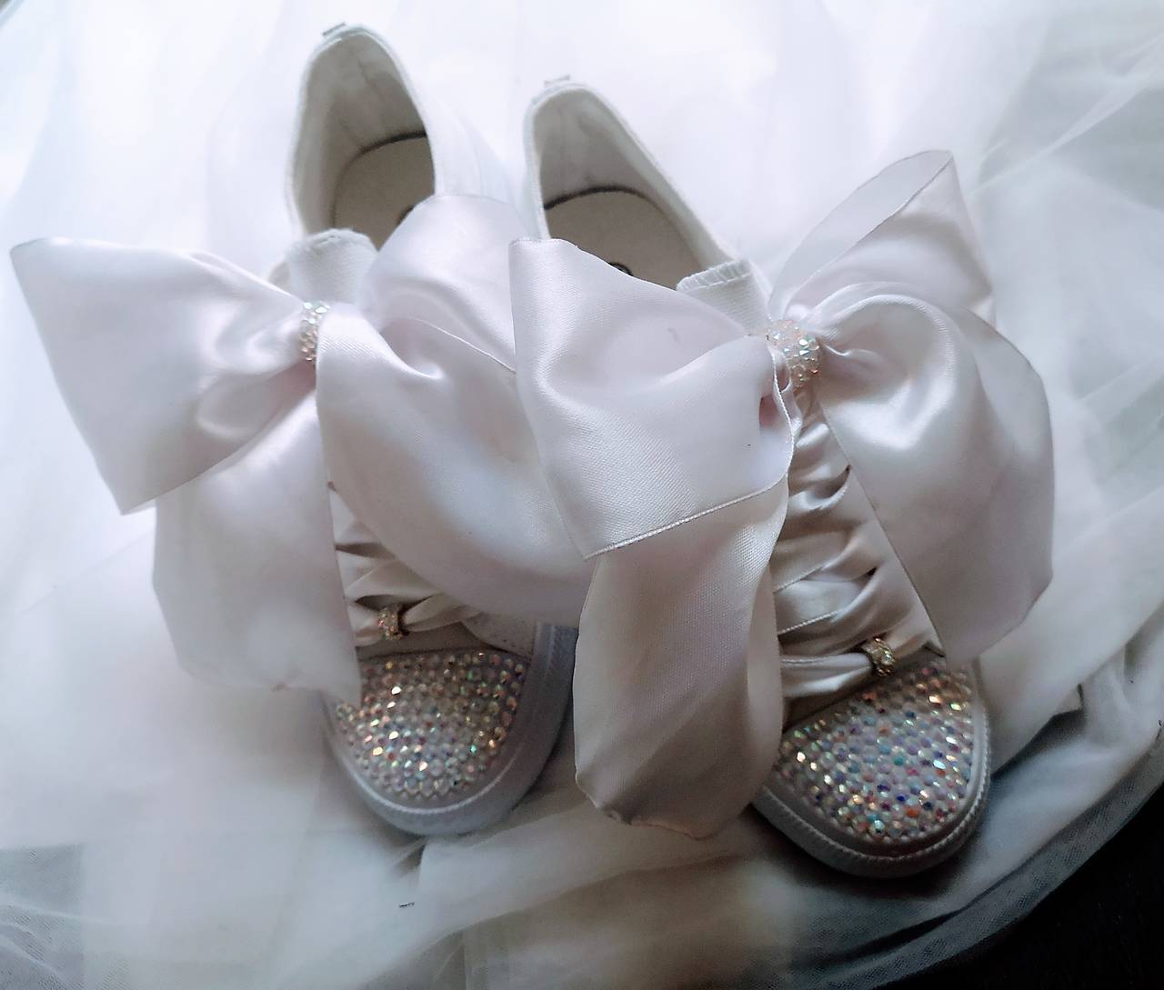 Tenisky zdobené AB kamienkami a veľkou mašľou. Tenisky sú biele vo veľkosti 36/42. Veľkosť mi napíšte do poznámky.