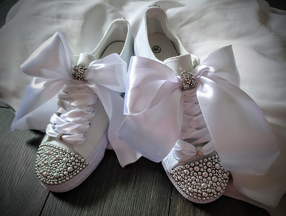 Tenisky sú zdobené striebornými perličkami a doplnené veľkou mašľou.