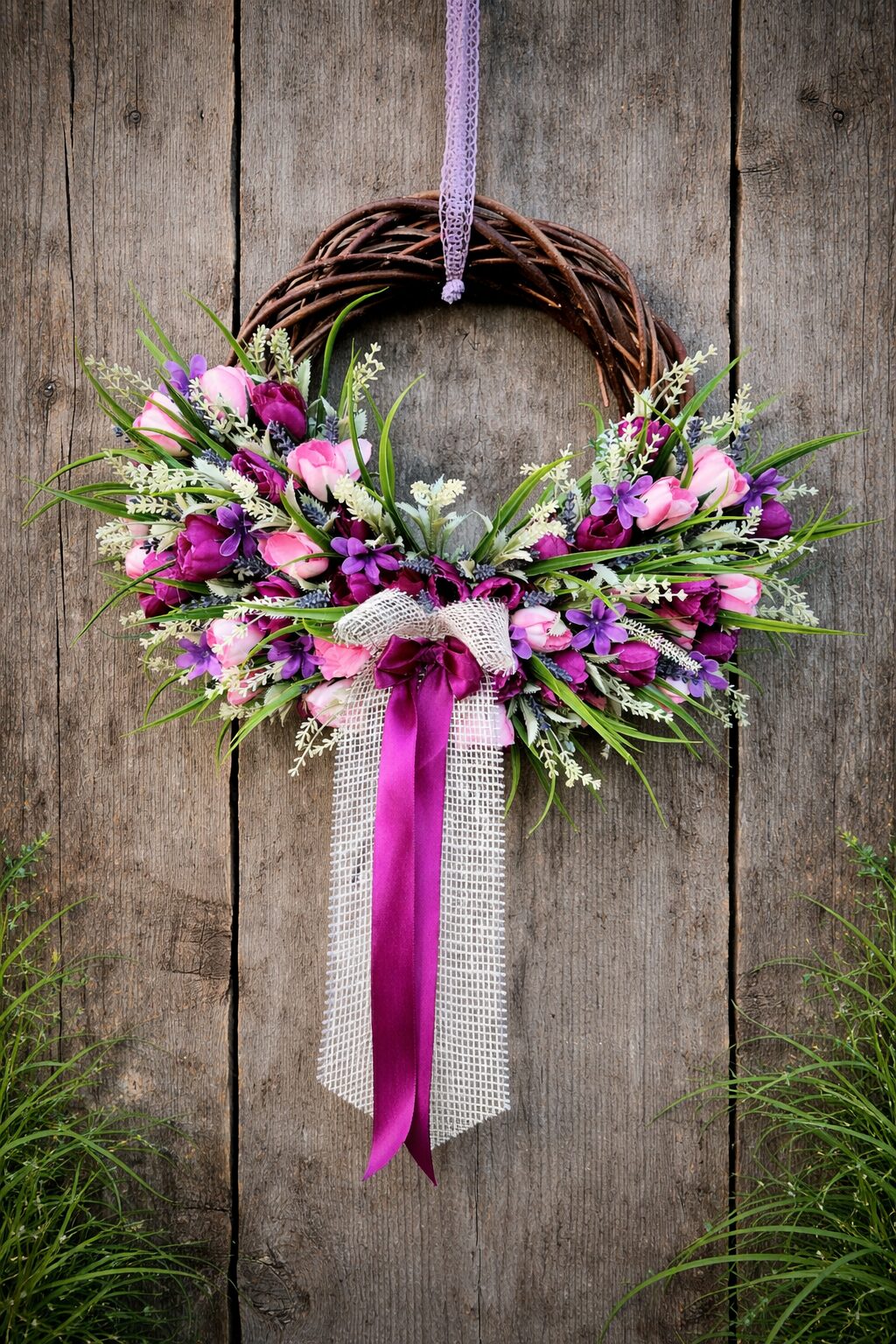 Veniec je aranžovaný na ratanovom podklade s kvetmi výraznej fialovej a ružovej farby.
