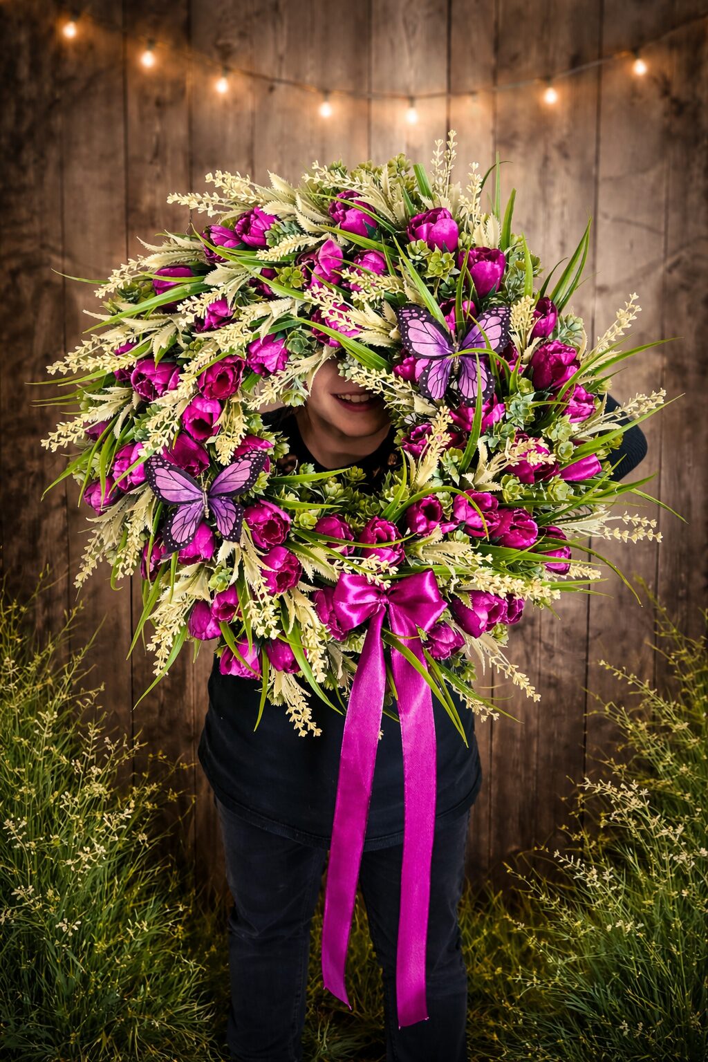 Jarný veniec z umelých krokusov na plastovom venčeku, priemer cca 45cm. Veniec má vzadu šnúrku na zavesenie.