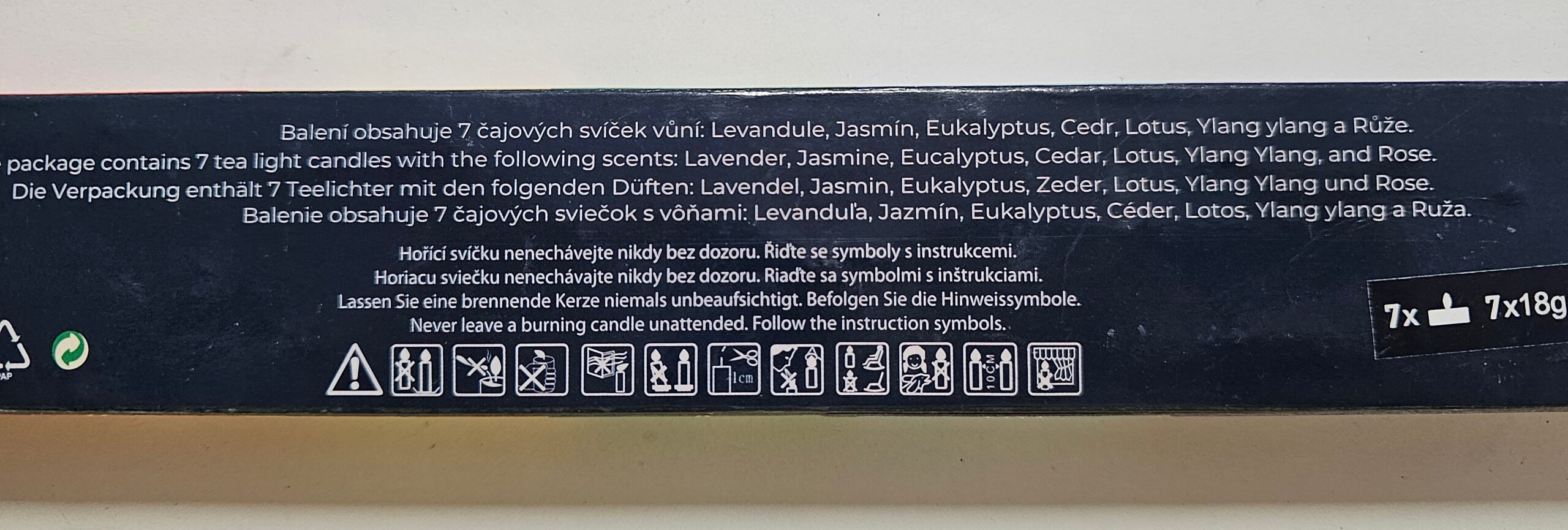 Sviečky majú vôňu (zoradené od koreňovej čakry po korunnú) ruže, ylang ylang, lotos, céder, eukalyptus, jazmín a levanduľa .