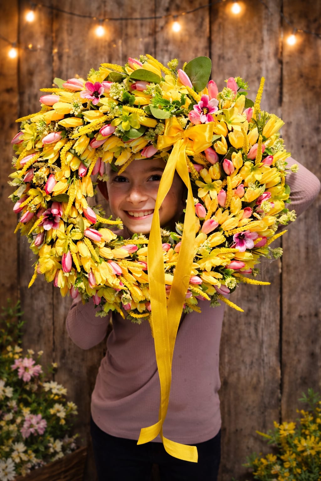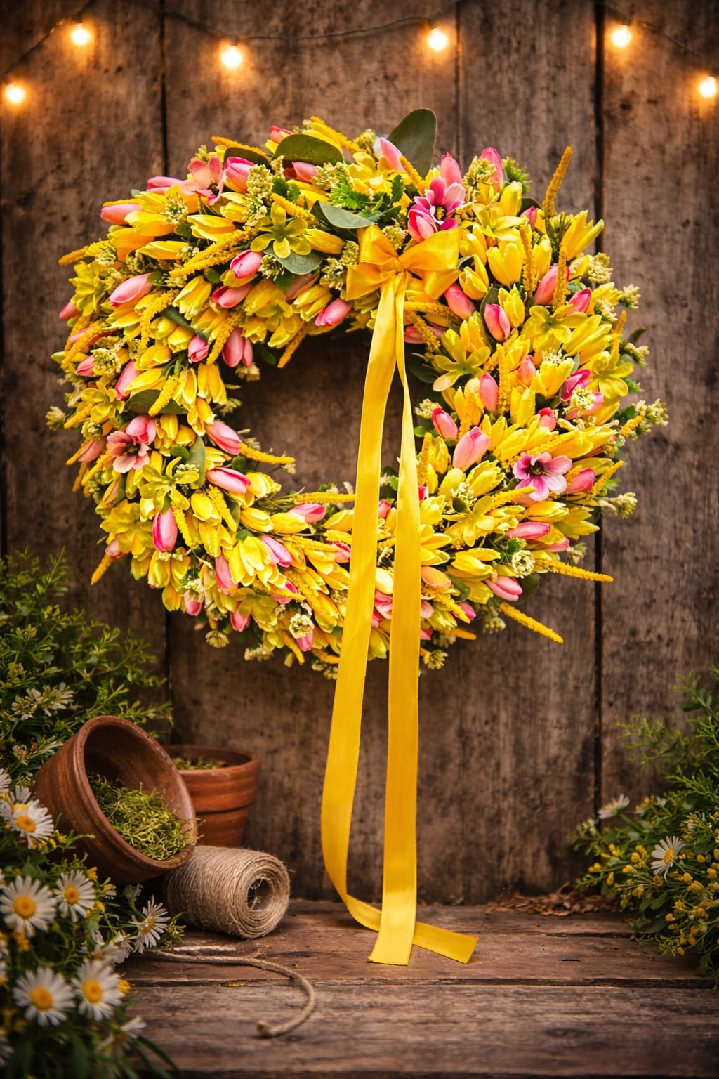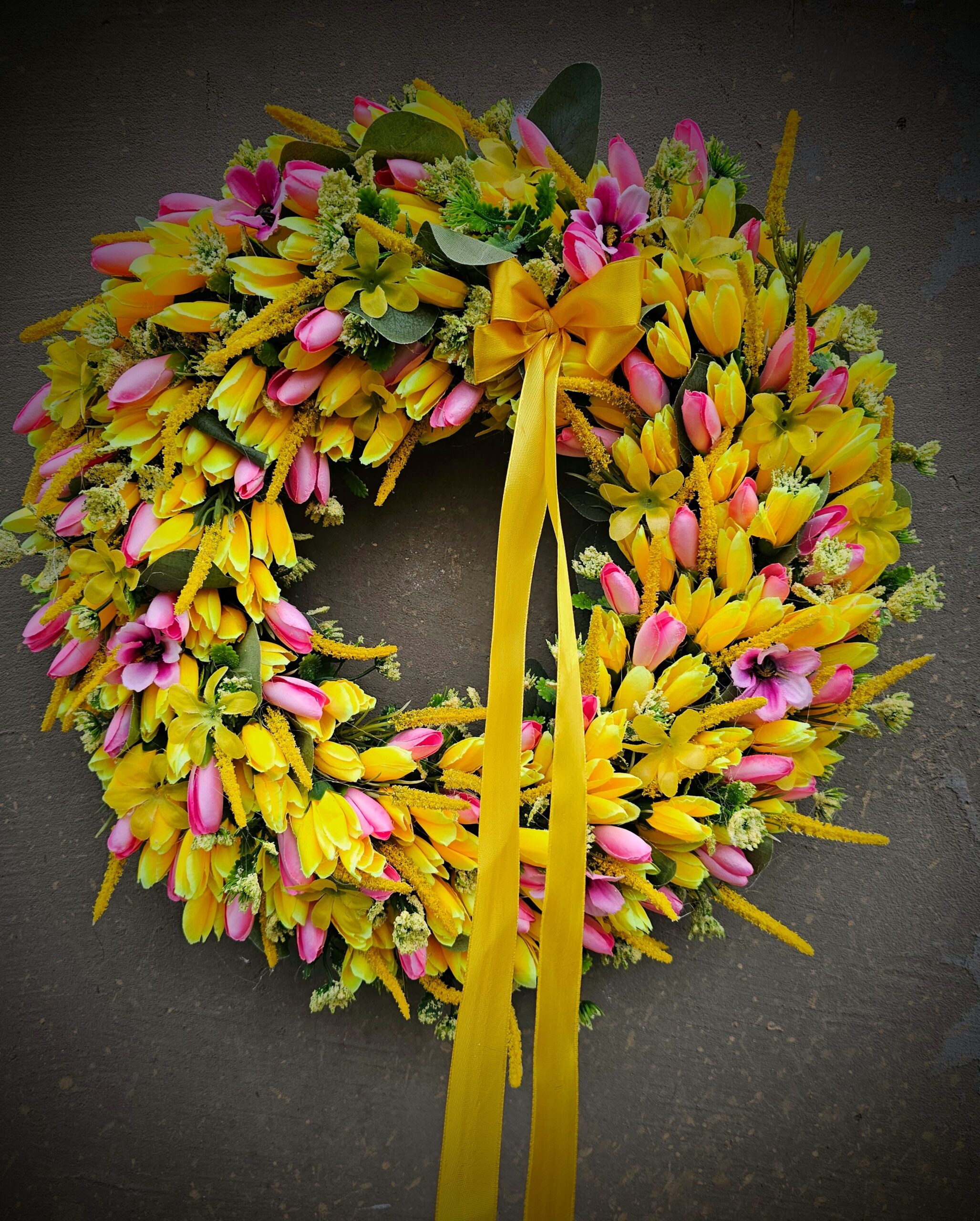 Veniec je aranžovaný na plastovom podklade, krokusy výraznej žltej a ružovej farby.